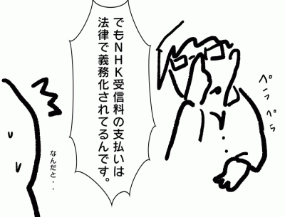 一人暮らしを始めた時のこと、 晩御飯を食べているとチャイムが鳴った。 インターホンに出てみると・・・ 「NHKです!」と元気な男性の声がした (こんな遅くに何の用だ?) すでに時刻は21時をまわっている。 …